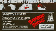 Vendredi 6 Mars 2026 21h INFOS (aller à la page de l'évènement) Partager Partager sur Facebook Partager sur Twitter Partager sur Google Plus Billets Sur place PAF: 9,00 € JS. Donny drone pop / Marseille Jonquera & Officium Downtempo nebuleux / Teenage Menopause Records Ionoss & Erevan DJ Foutraque d'inter-plateau Events